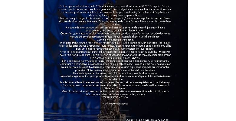 Tout en félicitant la nouvelle Miss Universe et adressant un message de soutien à Miss Universe Jamaïque, Olivia Yacé exprime sa gratitude pour le soutien reçu. Cette démission intervient dans un contexte de polémiques autour de présumées irrégularités impliquant le jury du concours, après l’annonce des résultats du 21 novembre dernier, où elle avait été classée 4e Dauphine.