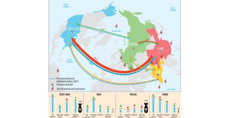 Dans un contexte de tensions géopolitiques croissantes, le monde est de plus en plus pris entre les États-Unis, superpuissance extractive, et la Chine, « superpuissance dépendante » dont l’influence mondiale repose sur la dépendance des autres pays à ses exportations. En l’absence de résistance significative, les deux pays devraient poursuivre leur course, les puissances moyennes étant contraintes de se plier à leurs exigences sous peine de représailles